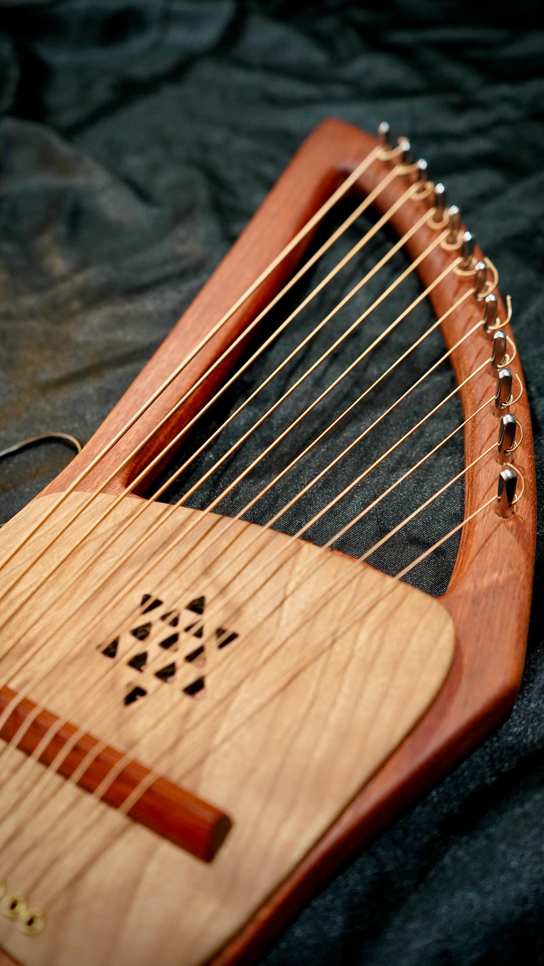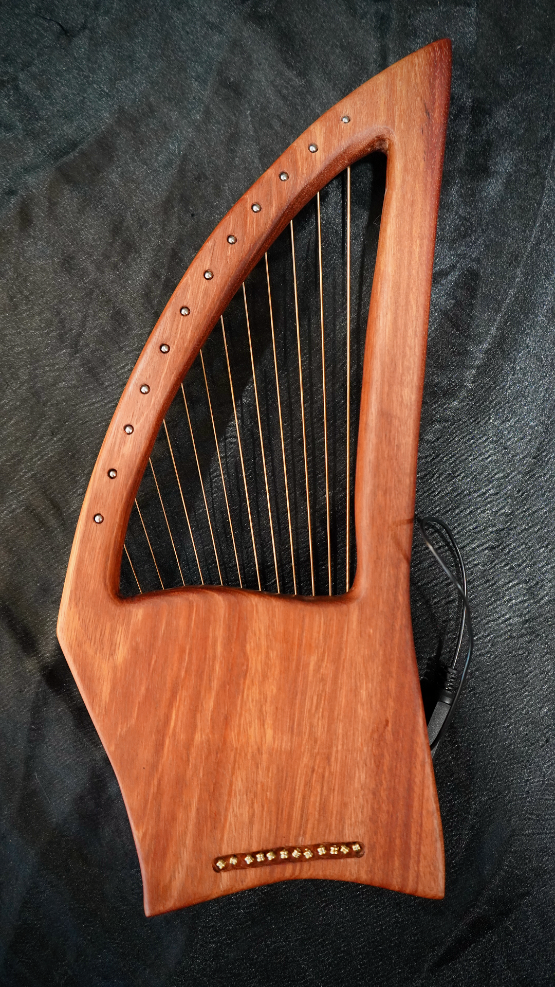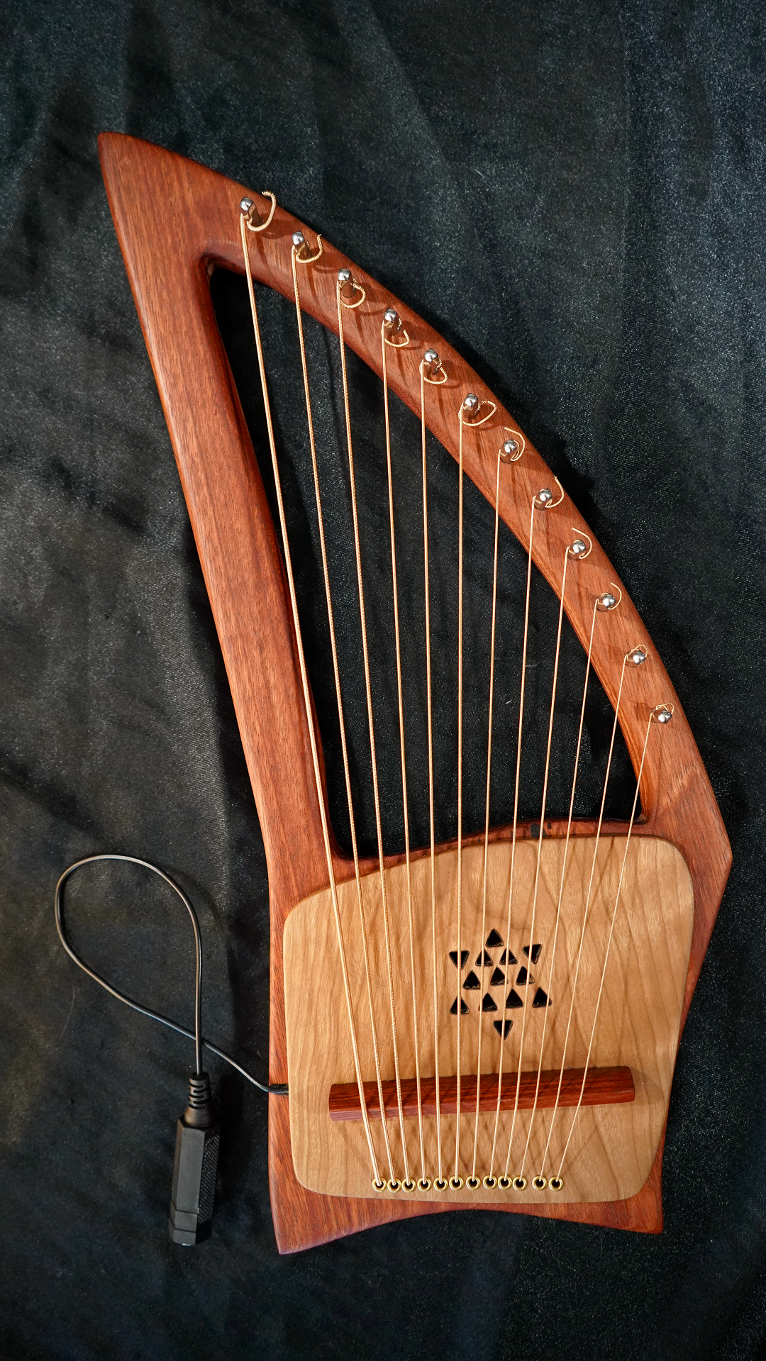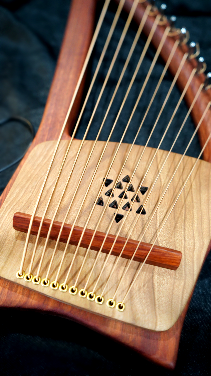 Lyre in D minor Pentatonic, 12 - String (metal), made of Exotic & local woods with tuning posts, comes with tuning wrench